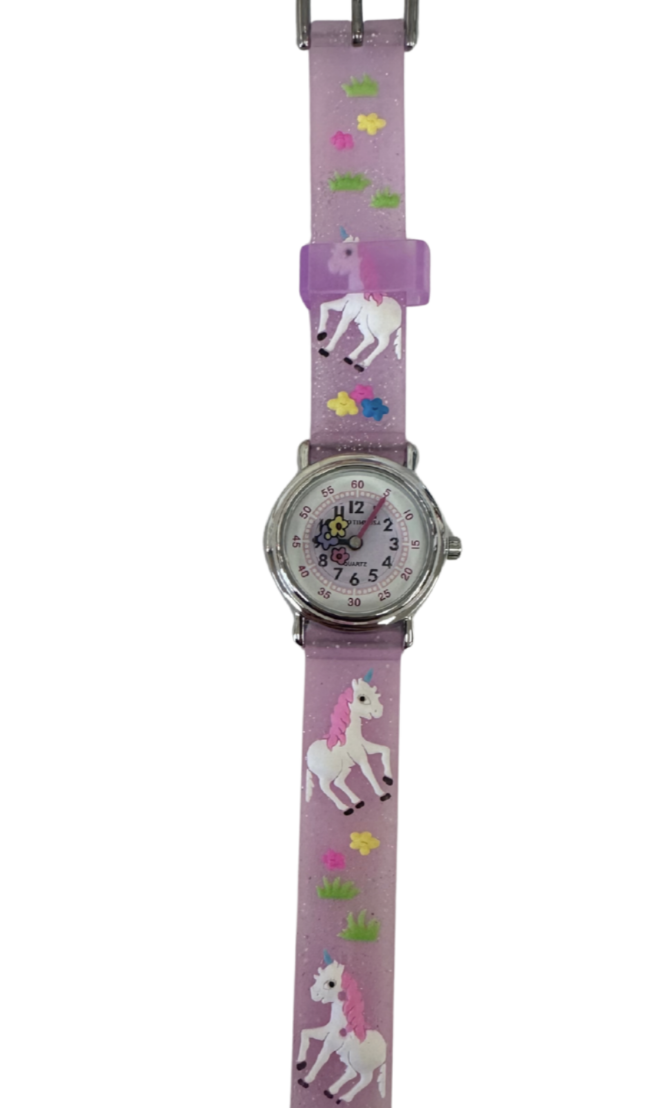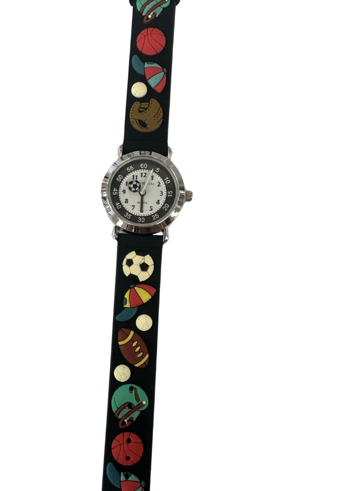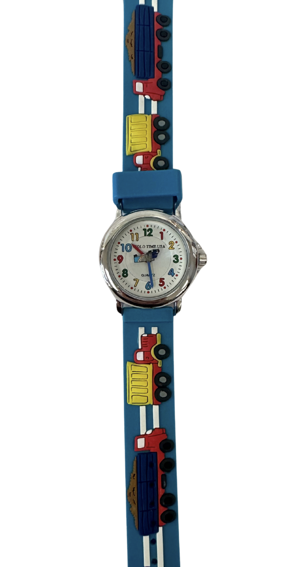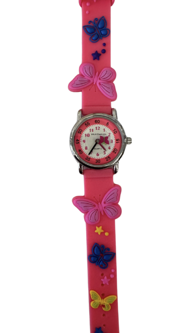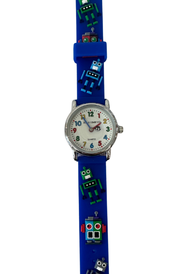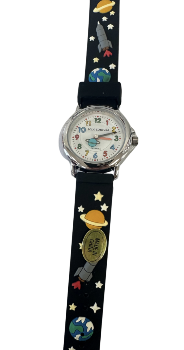 Solo Time USA quartz watches are manufactured to be a fun and a safe way for children to learn to tell time. These watches have a very comfortable band, rotating disc with unique second hand, and a teaching time dial. All watches come with stoppers in them so you will enjoy the full 1-2 year battery lifetime. Battery included.