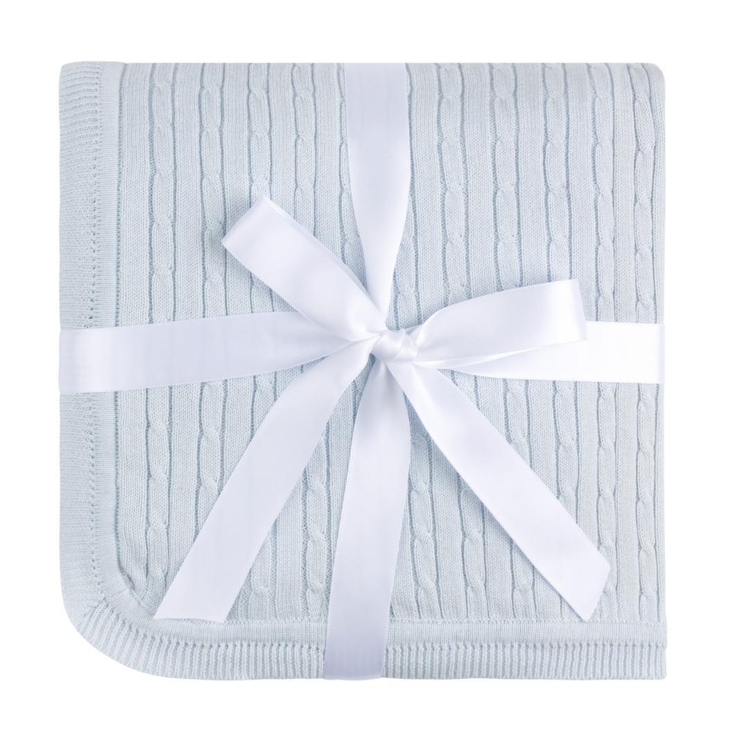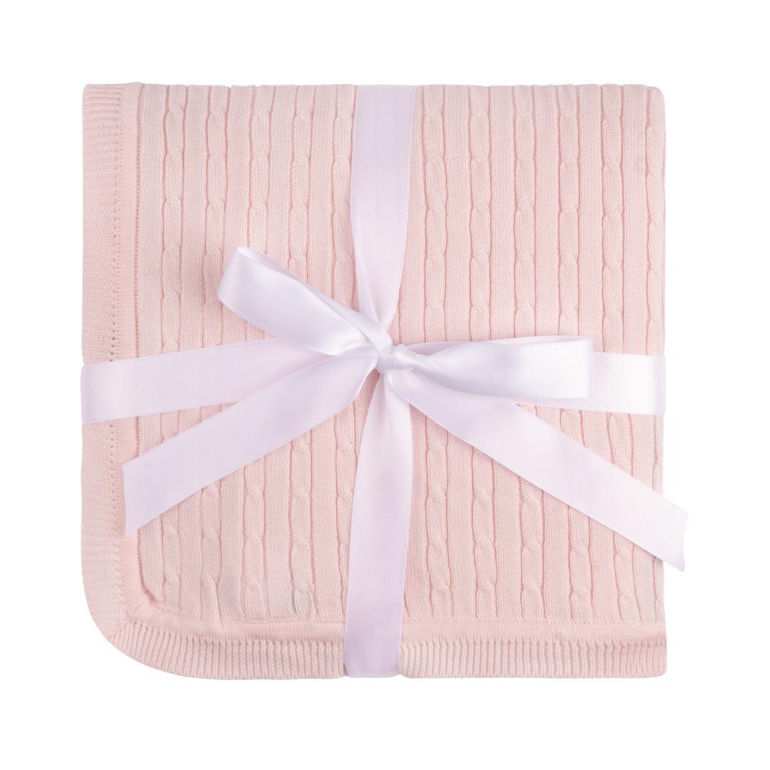An all new knit blanket in a cable design made from our soft cotton knit fabric. Available in blue and pink, this beautiful blanket will keep your little one toasty warm without sacrificing on style! Coordinates with our boys and girls cable Knit Rompers to make the ultimate layette gift.