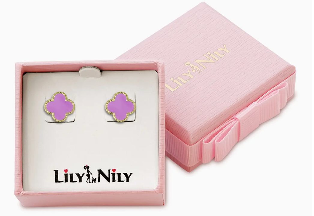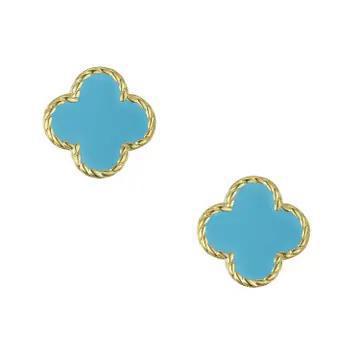 These beautiful stud earrings feature four leaf clovers with hand painted enamel and are adorned with 18k gold plating. Posts secure with friction back clasps. * Metal Type: Brass * Plating: 18k Gold * Earring style: Stud * Enamel: Hand Painted * Stud Dimensions: 9.5 x 9.5 mm * Clasp: Friction Back
