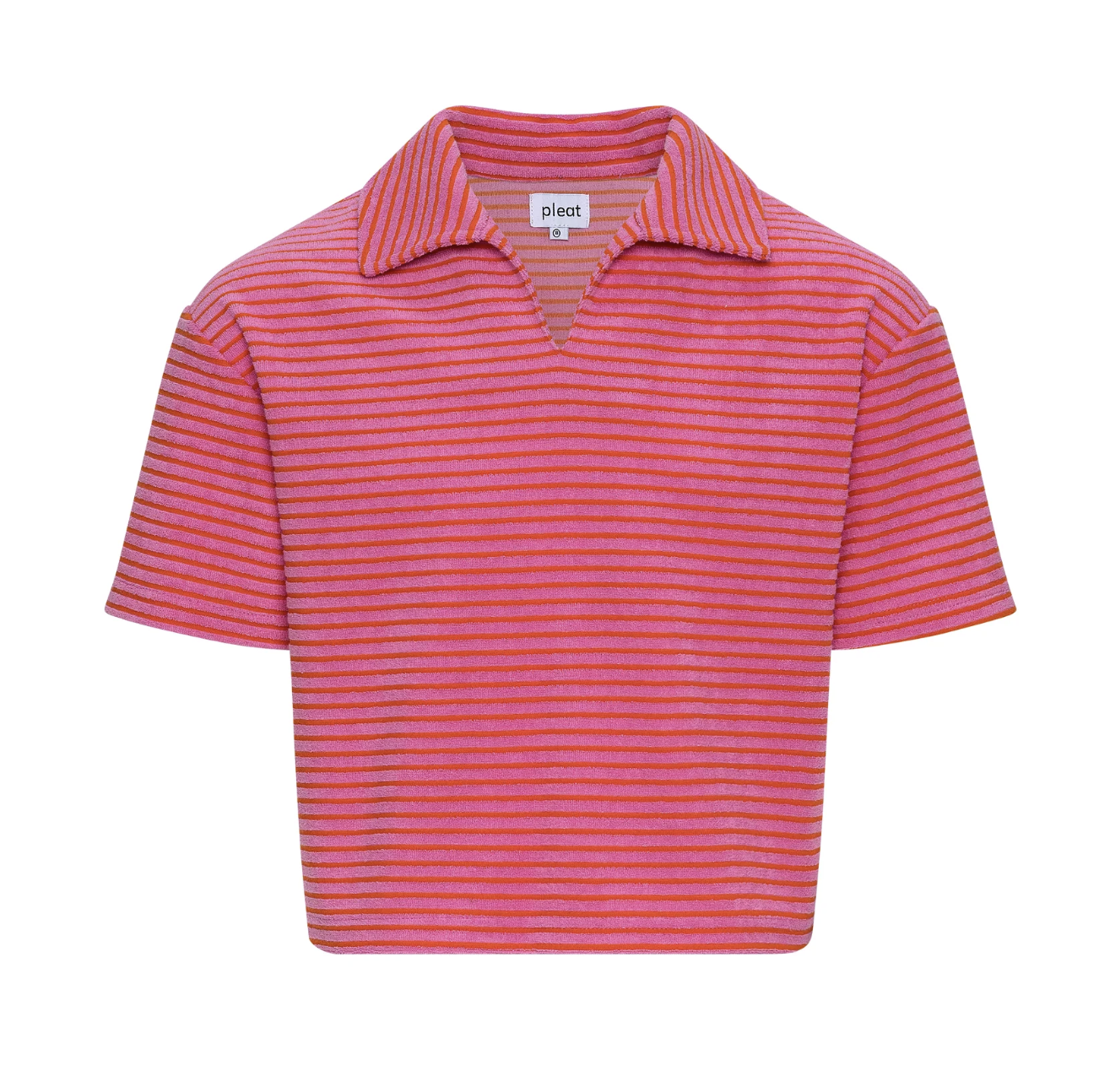 The soft French terry fabric feels soft yet lightweight, making it perfect for everything from pool days to playdates. The bold pink and orange stripes add a fun pop of color!