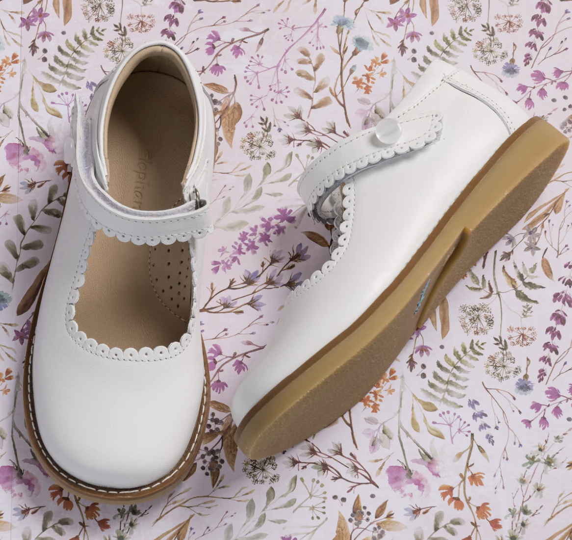 The Elephantito Classic Mary Janes combine style and functionality with supported ankles and scalloped edges. Handcrafted from premium leather, these shoes offer durability and quality. The natural sheepskin lining provides softness, protection, and absorption. Lightweight and flexible rubber soles ensure ample support and grip. Recycled leather insoles with Bontex cushioning add extra comfort. Reinforced heel and toe protect growing feet. The hook-and-loop closure ensures a perfect fit and easy wear.