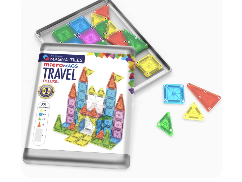 Our original 26-Piece Travel Set was such a sensation that we had to dream bigger! This larger, 55-piece version takes on-the-go play to the next level! Perfect for car rides, vacations, restaurants, and beyond, this set features a convenient travel case so you can bring magnetic fun wherever life takes you. With tiles 75% smaller than traditional MAGNA-TILES, it’s perfectly sized for portability. Fully compatible with all MAGNA-TILES sets, you can seamlessly expand your collection for frustration-free building fun.
