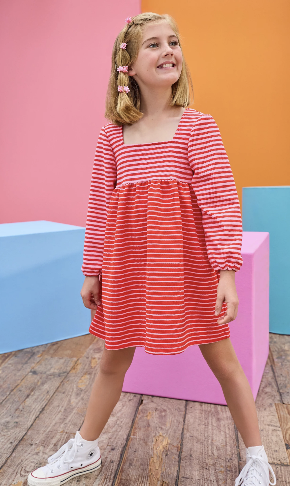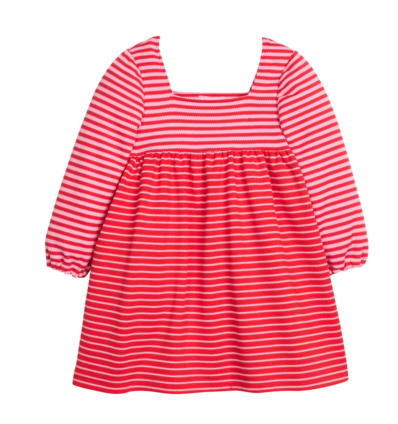 The Cora Dress features bold pink and red stripes that bring instant cheer! This dress features a square neckline, elastic cuffs, and a flared fit that makes every day feel a little more fun.