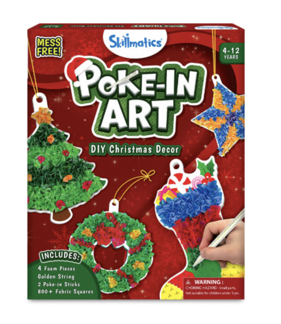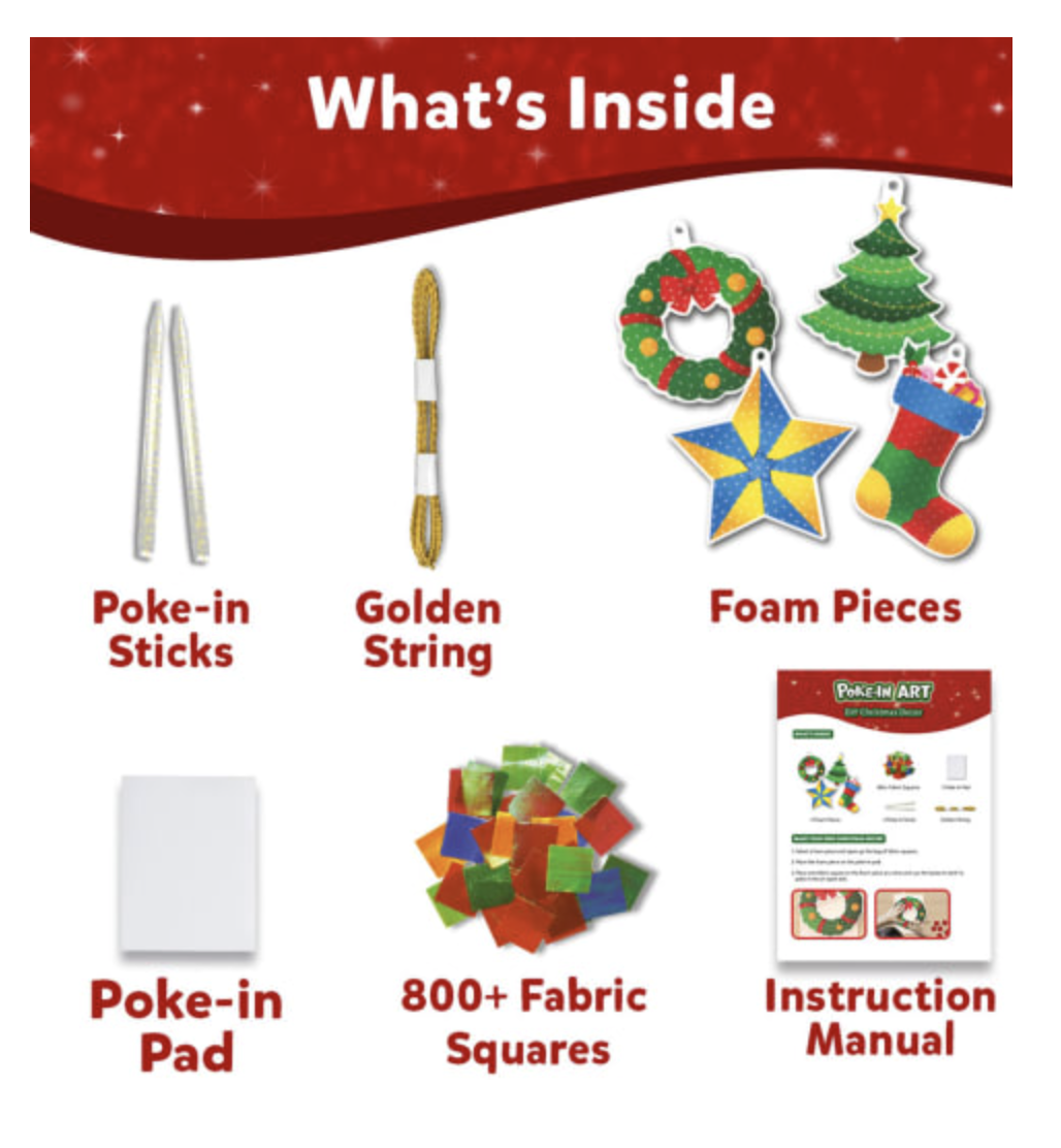 This mess-free activity set sparks creativity as kids create their own unique holiday decorations using fabric squares, and Christmas-themed foam shapes like a wreath, tree, star, and stocking. Once complete, use the golden string to create a holiday garland and hang them around the house!