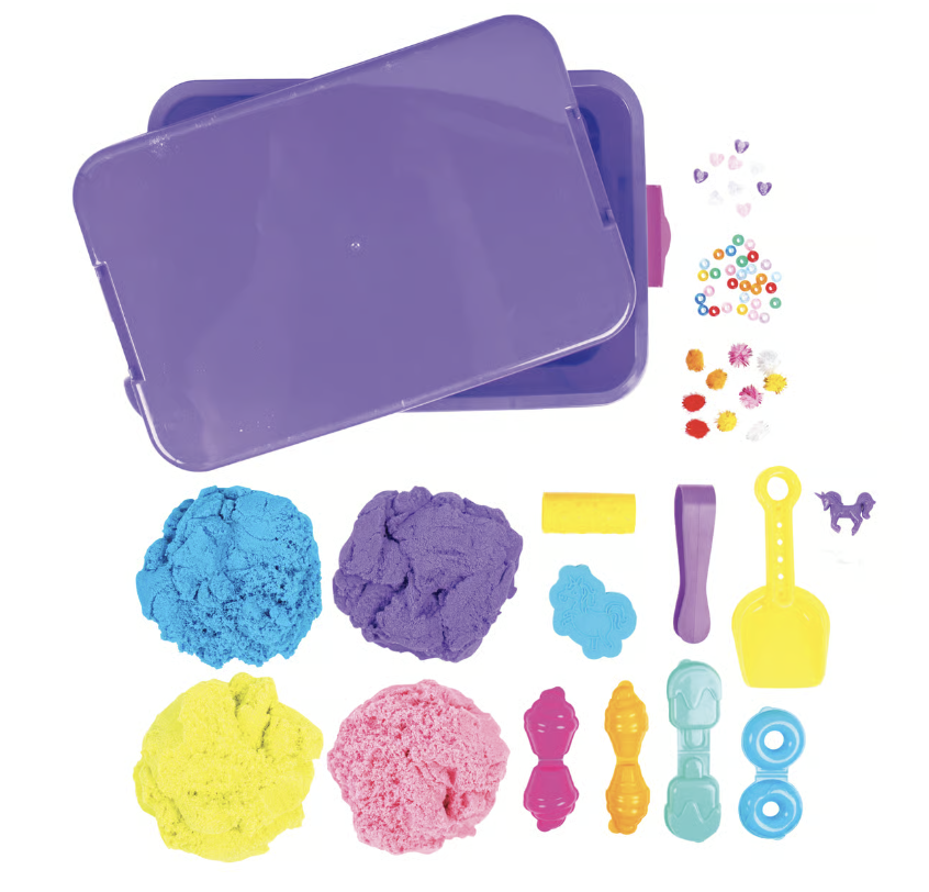 - Get hands-on with play sand, beads, unicorn figurines, and glittery pom balls - dump, scoop, shovel & pinch them with the shovel and pair of tongs
